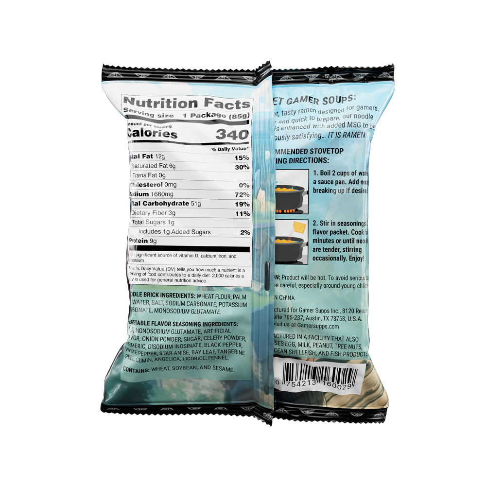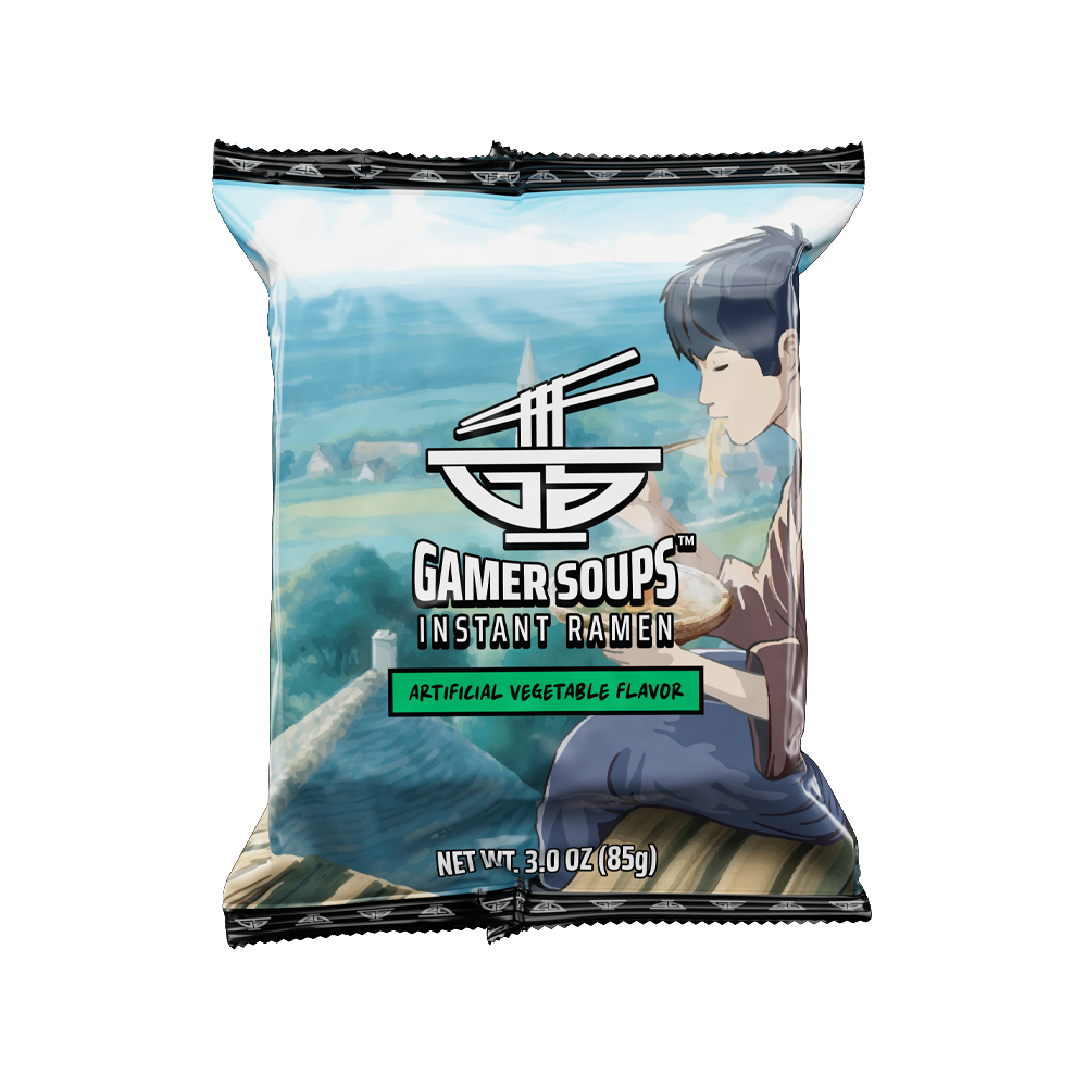 Instant, tasty ramen designed for gamers. Cheap and quick to prepare, our noodle soup is enhanced with added MSG to be deliciously satisfying… IT’S RAMEN!!!