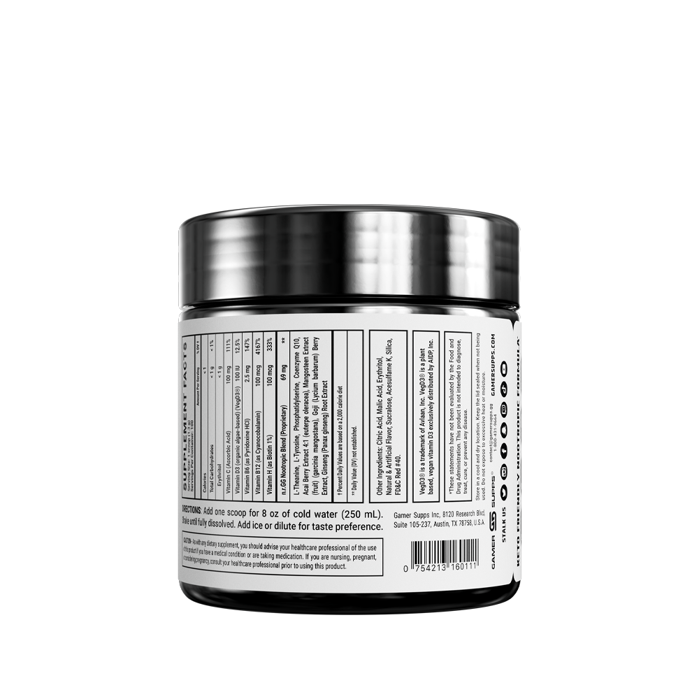 GG is the ultimate energy and focus formula designed to Level Up Your Gaming. The highest quality ingredients make up an energy formula that mixes completely and provides a healthier and more cost effective energy drink.