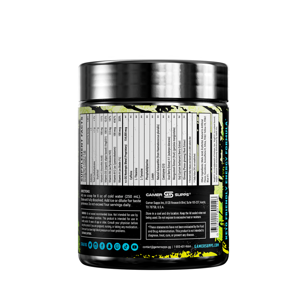 GG is the ultimate energy and focus formula designed to Level Up Your Gaming. The highest quality ingredients make up an energy formula that mixes completely and provides a healthier and more cost effective energy drink.